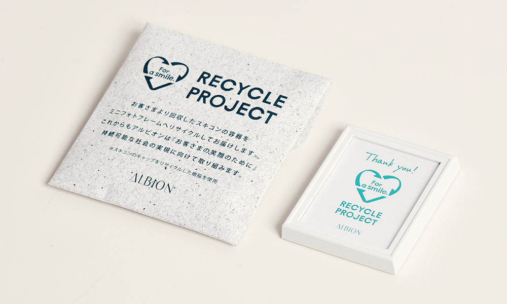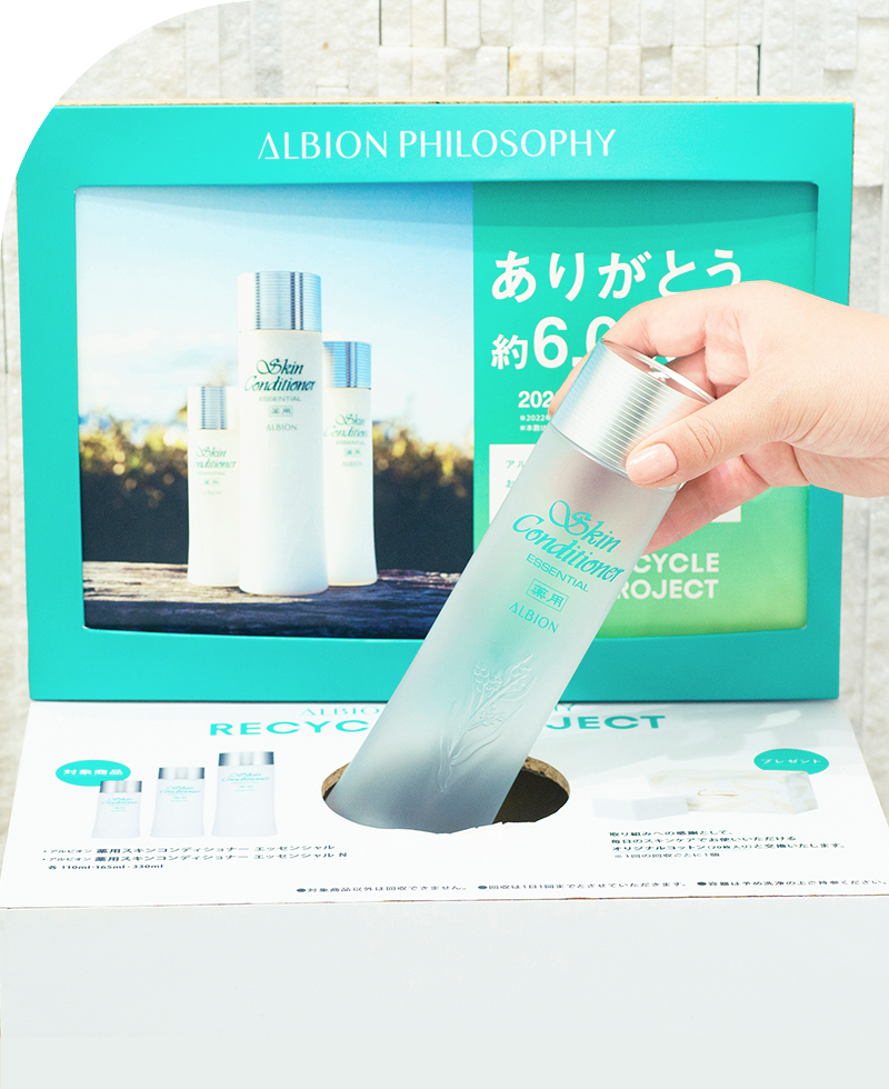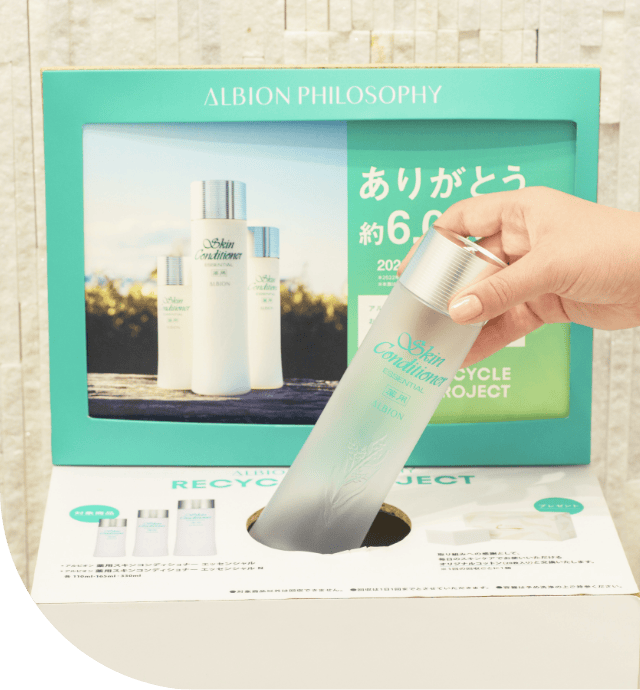 アルビオンではサステナビリティ経営の実現に向け、「資源の循環」というテーマを設定しています。その取り組みのひとつとして使用済みスキコン容器の回収を一部の店舗で実施しています。