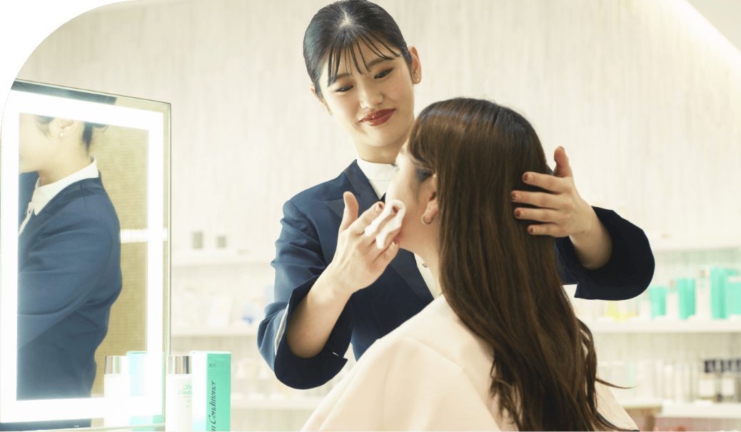 販売現場ではお客様の肌のことやニーズをお伺いし、おひとりおひとりに合わせた商品を、肌で体験していただくご紹介活動をしています。