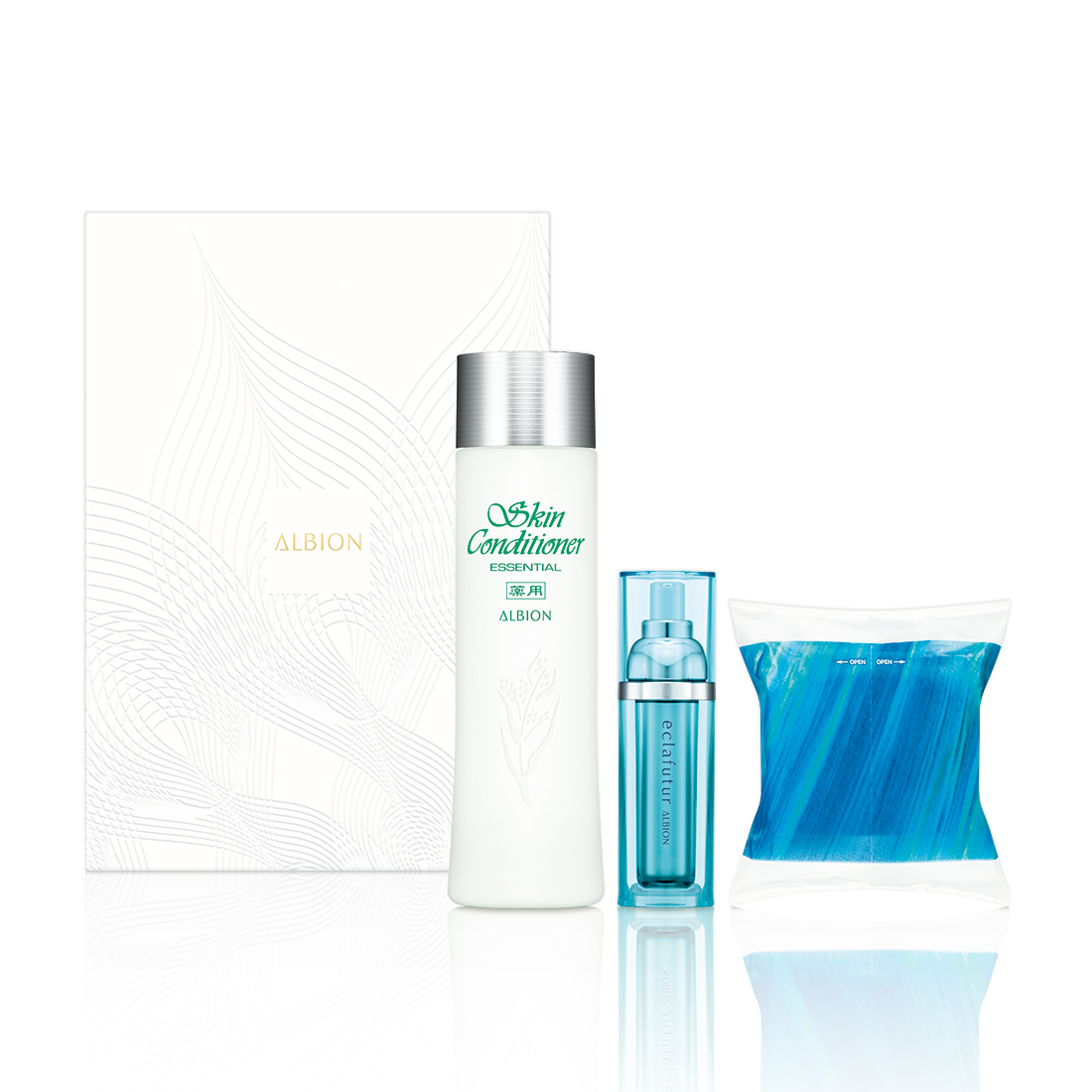 アルビオン創立70周年記念。たっぷり使える!薬用スキンコンディショナー エッセンシャル Nの330ml現品と、エクラフチュール t、コットンがセットになったスペシャルキット。